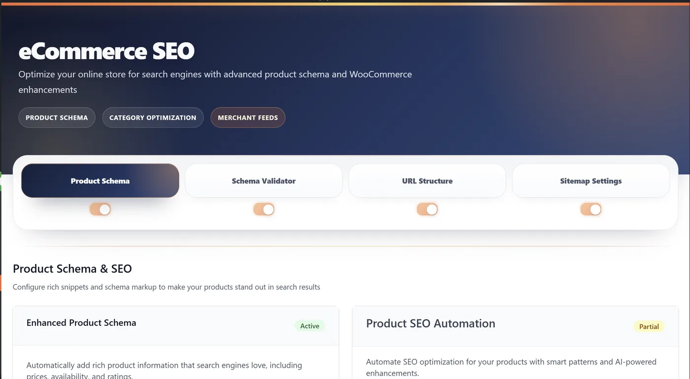 eCommerce SEO — product schema, validation, URL cleanup, and WooCommerce-specific settings