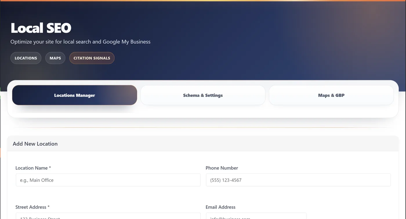 Locations Manager — add locations, configure schema, embed maps, and connect Google Business Profile